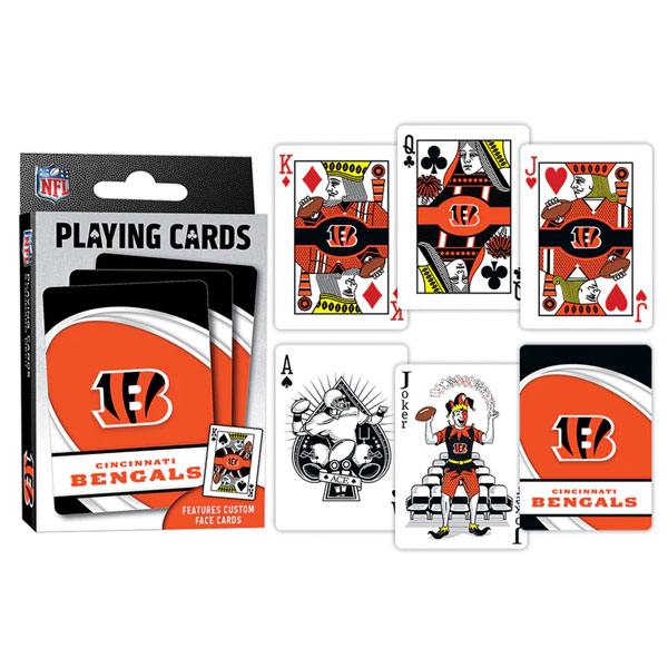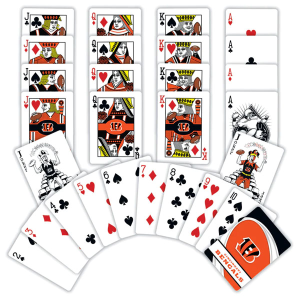These officially licensed playing cards are the perfect deck for all Cincinnati Bengals fans! Each standard deck contains fifty-two playing cards and two jokers printed on high quality cardstock. All face cards and jokers feature a unique Cincinnati Bengals design and the card-back design includes the Bengals logo.